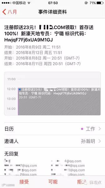 简单来说,推送者利用苹果的邀请或共享机制,直接通过填入邮箱地址进行传播。虽然目前互联网上主流垃圾信息过滤机制,都会对邮箱、链接、信息内容的敏感词进行过滤,但这种日历活动分享却并不在过滤检测当中。也就是说,这种广告信息几乎绕过了目前所有的垃圾过滤机制,而这也是它如此猖獗的主要原因,即便是苹果也拿它没办法。