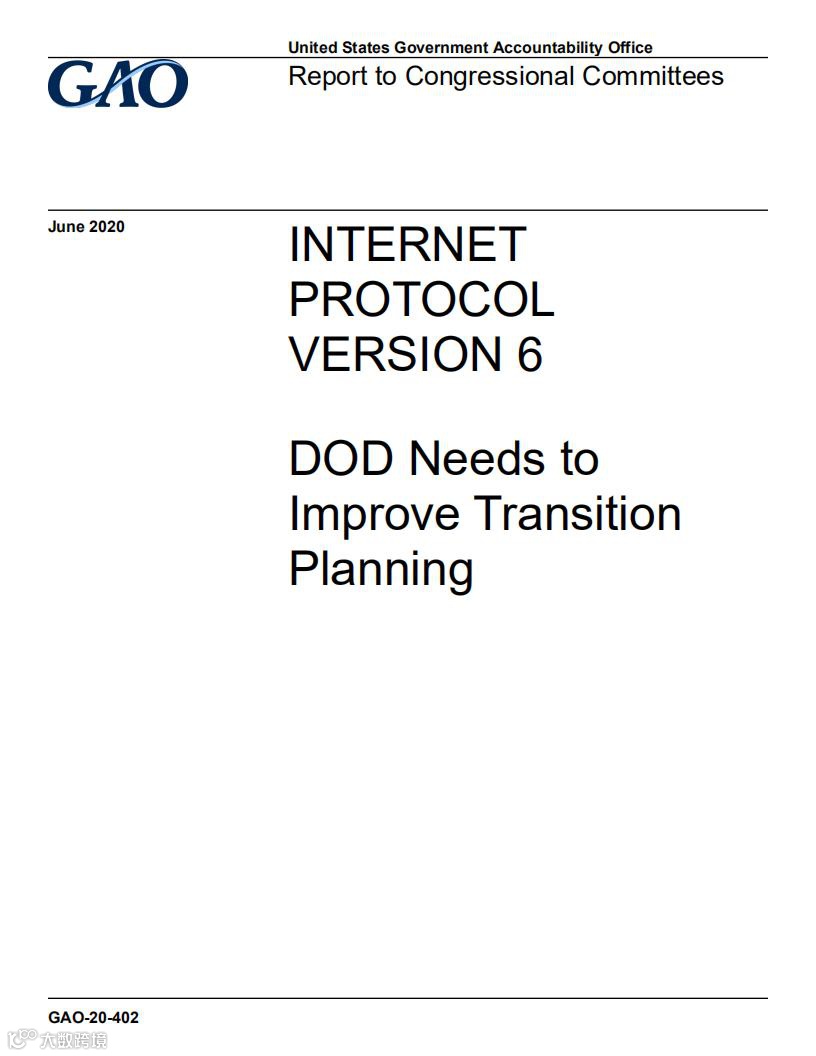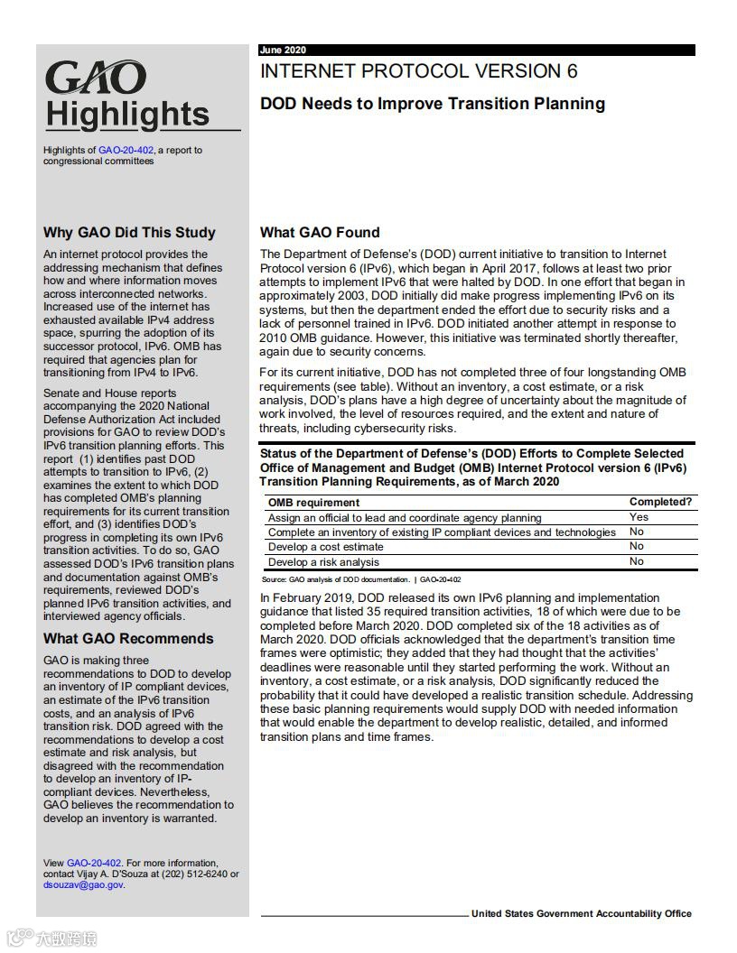 美国政府问责局(GAO)6月1日发布名为《IPv6:国防部需改善迁移计划》的报告指出,美国防部前两次以安全担忧为名解释前两次IPv6部署尝试失败,第三次尝试则严重滞后于其自身部署计划。报告指出,国防部IPv6部署进程滞后的主要原因是未遵守白宫管理和预算办公室(OMB)2006年提出的基本要求,尤其是未能创建IP设备清单、未能做出成本估算以及未能提出风险分析,从而面临成本超支、进程延迟和补丁管理复杂等风险。奇安网情局编译相关内容,供读者参考。