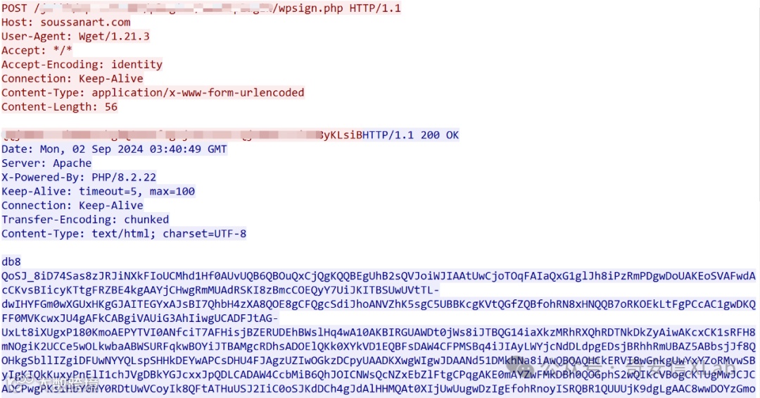 以"soussanart.com"为例,它是一个艺术品交易网站,被DarkCracks入侵,将其变身为C2基础设施。我们构造了以下网络请求,用以查询和此C2通信的Bot的详细信息。