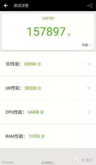 同时,根据曝光的跑分数据情况来看,该机型号为LEX720,跑分达到157897分。具体数据为,3D性能为62696分,UX性能为50038分,CPU性能为34408分,RAM性能为10755分。
