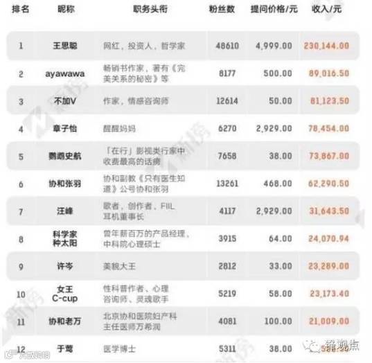 根据一份调查报告,在分答最近的收入TOP 100用户榜上,除王思聪、汪峰、章子怡、情感专家“不加V”外,ID名为“科学家种太阳”的中科院心理硕士也名列前茅。分答上活跃的医生覆盖内科、胸外科、妇产科、牙科等领域,他们大多是医学博士,提问价50元以内,似乎比专家挂号还划算。