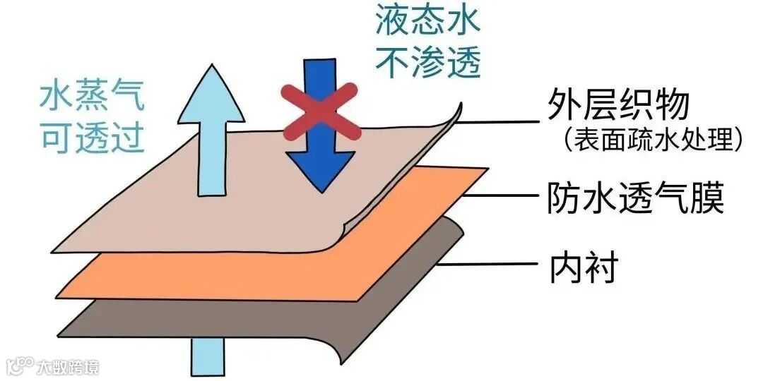 第一种成分是防水透气薄膜。这层薄膜是防水的主力,它通常夹在外层织物和内衬的中间。