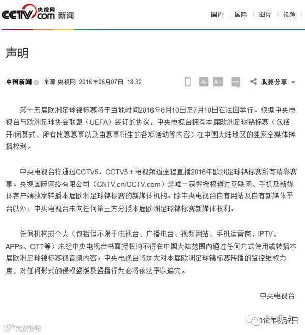 很快央视发声明强调“央视拥有欧洲杯在大陆的独家全媒体转播权。除中央电视台自有网站及自有新媒体平台以外,中央电视台未向任何第三方分授新媒体权利”。