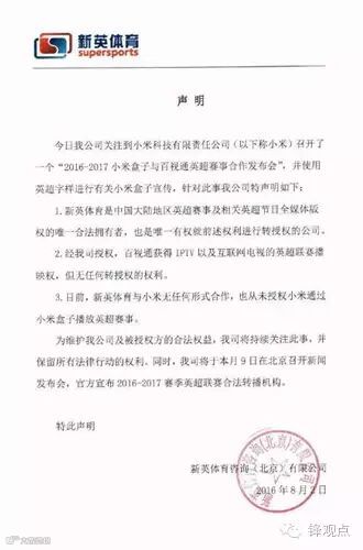 从新英体育的声明看,小米所宣称获得英超赛事转播权的说法根本站不住脚。新英体育的声明,将身陷英超版权“罗生门”的小米打了个措手不及。