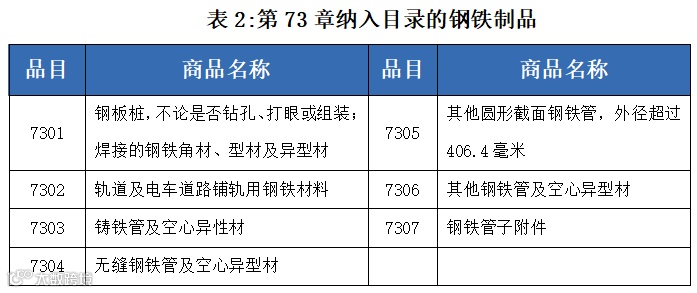 《税则》第73章(钢铁制品)共约180个10位编码,本次纳入76个,集中在税目7301–7307,主要包括钢管、钢轨、钢丝、钢钉等典型制品。