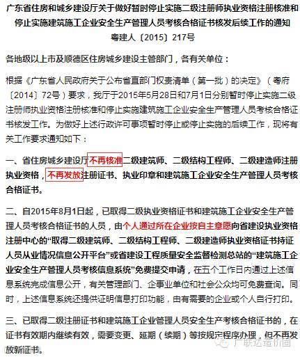 广东省住房和城乡建设厅发布通知,广东省建设厅不再核准二级建造师、二级结构工程师,二级建筑师和三类人员证书(就是我们所说的ABC)。或者说通过建造师的考试以后,直接领取资格证,再由建筑企业进公示信息平台去填报即可。