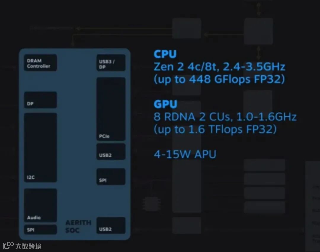 在本周的开发者直播活动中,Steam Deck官方介绍了其配置详情。掌机Steam Deck搭载的是一颗V社向AMD定制的SoC芯片,代号Aerith,实际对应AMD Van Gogh(梵高)家族的APU处理器,7nm工艺,功耗4~15W。CPU部分基于Zen 2架构,4核8线程,2.4~3.5GHz。GPU方面采取RDNA2架构,频率1~1.6GHz,1GB显存,支持FSR、DX12等。