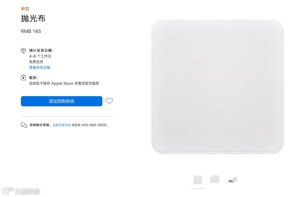 苹果昨天发布了一块超细纤维的抛光布,专为清洁苹果设备的屏幕而设计,售价145元,4-6 个工作日发货。