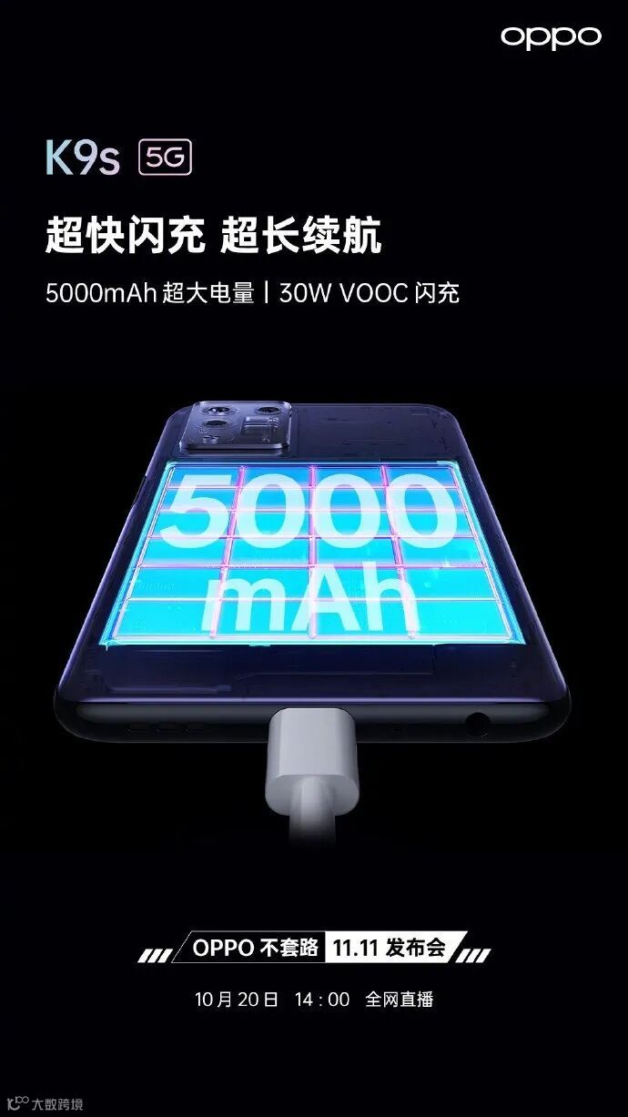 近日OPPO透露,将于10月20日举办“OPPO不套路11.11发布会”,届时将发布OPPO K9s 5G新机。在近日的预热中,OPPO宣布新机具备5000mAh超大电量,同时支持30W VOOC闪充。作为OPPO K9的升级版,OPPO K9s相比上一代的4300mAh提升明显。根据此前曝光的信息,OPPO K9s搭载高通骁龙778G处理器。