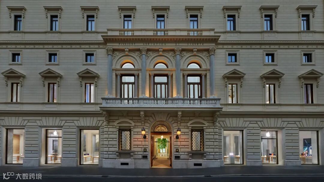 正面是由 Guilio Podesti 设计的,苹果公司与 Foster+Partners 合作重新设计了内部,保留了传统的意大利帕拉佐建筑风格。