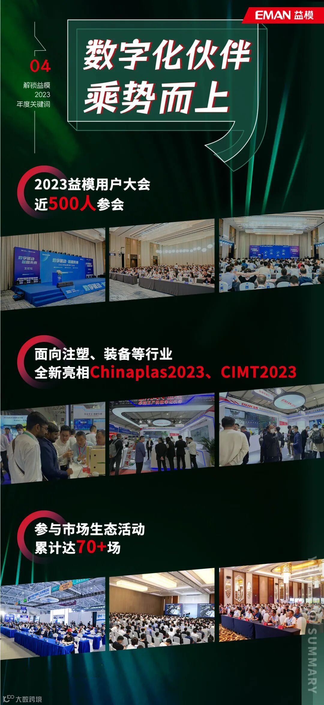 此外,益模还在CHINAPLAS2023橡塑展、2023CIMT中国国际机床展等近百场行业高知名度、高影响力展会及市场活动高频亮相,向来自国内外企业及嘉宾全方位展示益模产品服务及解决方案,以卓越的产品力和创新的方法论,为制造企业实现数字化转型贡献益模力量。