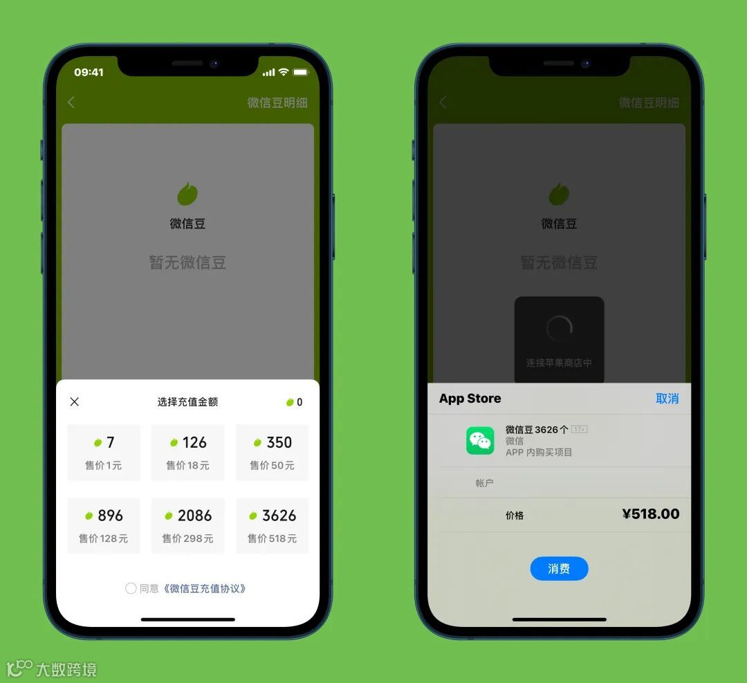 和其他虚拟类道具一样,微信豆也可以通过苹果内购平台充值,比例为「1:7」,一次性可最高充值 3626 枚微信豆,换算成人民币的话是 518 元。