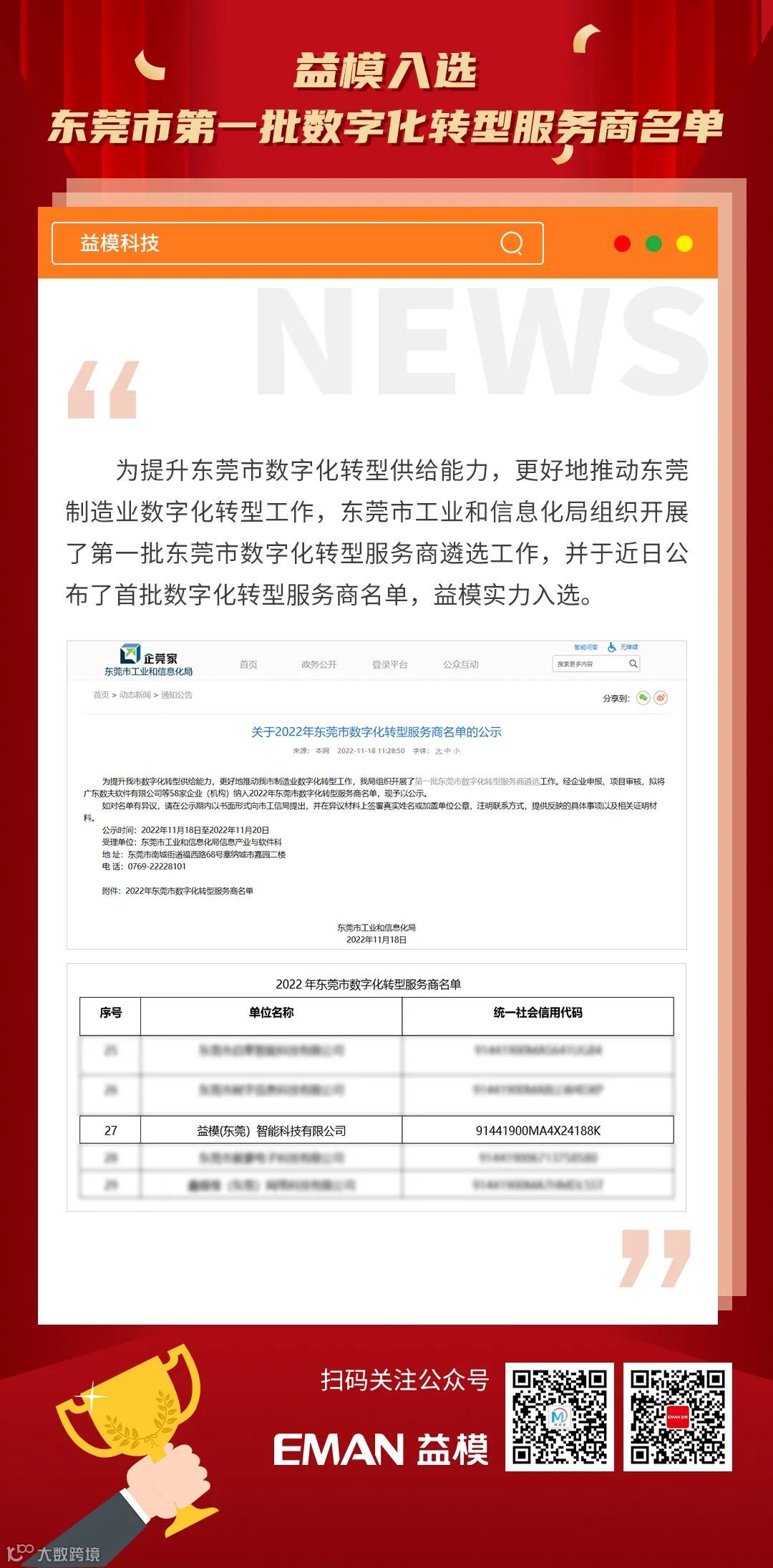 入选东莞市首批数字化转型服务商,是政府机构对益模产品力、实力、服务力等综合实力的重要肯定,