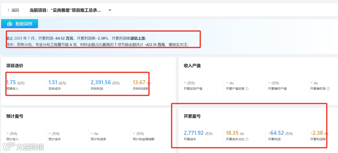 现在:实现多维度(科目级、合约级、费用明细)的“三算对比”分析,自动标红亏损项,及时发现成本风险并追溯问题源头。
