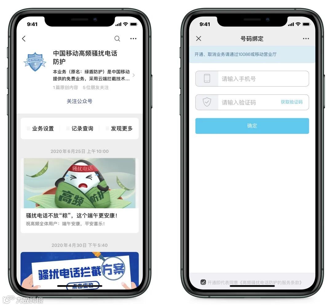 2.进入微信公众号「中国移动高频骚扰电话防护」,绑定手机账号进行自定义设置。