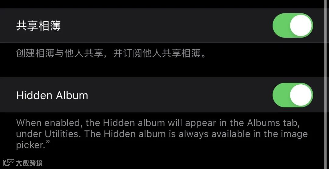 在「相册」中添加了「隐藏相簿」开关,用户可自主设置「隐藏相簿」,打开后即可相册中查看「已隐藏」的相册分类,不过此功能仍未汉化。