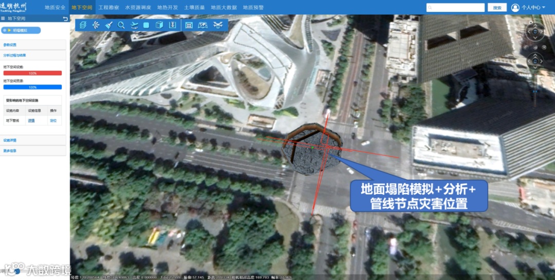 支持在线接入监测的城市地下空间运行安全与防灾信息,模拟岩溶、地下空间过度开发等因素诱发的地面坍塌事故,并根据坍塌的位置和影响范围进行空间分析,还原事故发生现场及事故影响范围和设施,为地面塌陷应急处理提供支撑,提高城市应急处置和抗灾能力。
