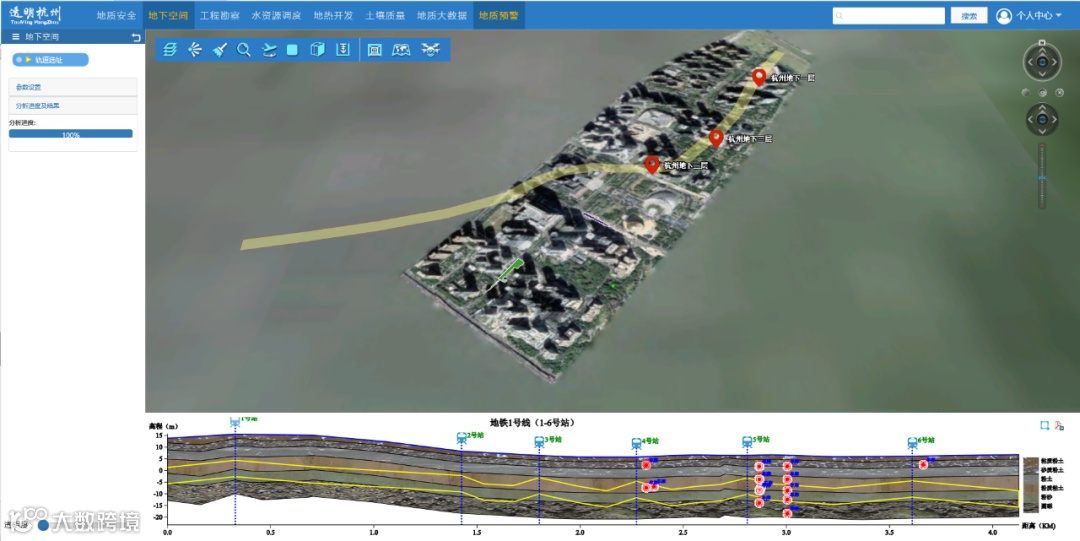 通过分析地下轨道交通选址方案,判别线路穿越地区的地质条件(地质条件、地下水和地下空洞)和地下空间已有设施(地上构建筑物的桩基和地下构建筑物)情况,为城市进行地铁、过江隧道等轨道交通规划、选址与施工提供有力技术支撑。
