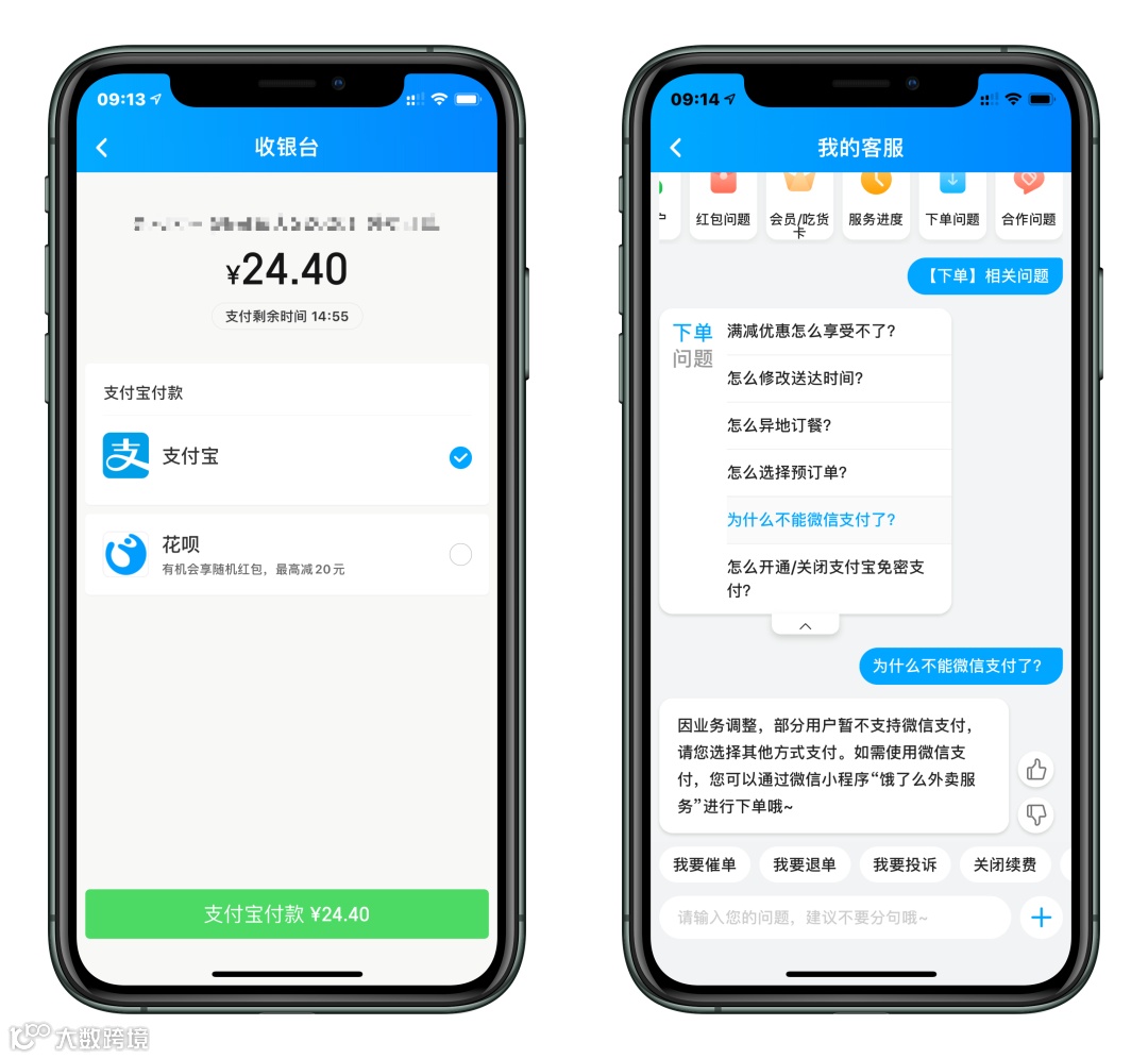 经过实测发现,在饿了么 app 的支付页面仅有支付宝和花呗,的确没有微信支付入口。但通过后台客服咨询的得到的回应是「部分用户暂不支持微信支付」,微博上也有部分饿了么用户反映他们可以正常使用微信支付。