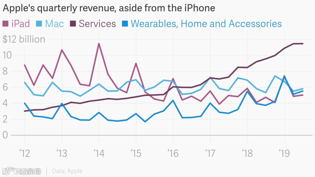 目前苹果的服务收入来源包括 iCloud、Apple Care+、Apple TV+、Apple News+、Apple Music、Apple Arcade、Apple Card,以及 Apple Store 固定的 30% 抽成。在 10 月底公布的 2019 年第四季度财报数据显示,服务业务是苹果所有业务类型中增幅最快的,达到 125 亿美元,比上年同期的 99 亿美元增长 26%,和同样在本季度获得增长的可穿戴业务一同拉高了第四季度的营收。