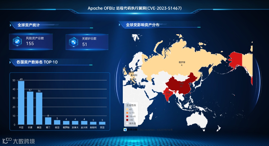 Apache OFBiz 远程代码执行漏洞(CVE-2023-51467)全球风险资产分布情况如下: