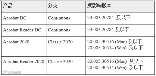 攻击者在成功利用一个界外写漏洞后,可利用该漏洞获得代码执行权限。Adobe 将该漏洞的评级为满分,并强烈建议管理员尽快在72小时时间窗口内修复该漏洞。该漏洞影响的产品如下: