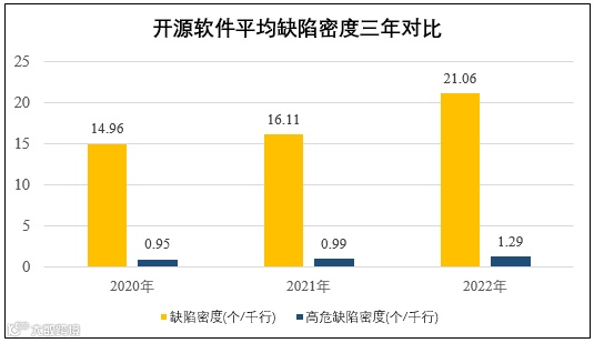 过去一年,开源软件漏洞数量持续增长,2022年新增的开源软件漏洞为7682个。根据“奇安信开源项目检测计划”的实测数据显示,三年来开源软件的总体缺陷密度和高危缺陷密度呈现出逐年上升的趋势,均处于较高水平,2022年全年,共对2098个开源软件项目的源代码进行了安全检测,代码总量为173174712行,共发现安全缺陷3646486个,其中高危缺陷222640个,整体缺陷密度为21.06个/千行,高危缺陷密度为1.29个/千行。