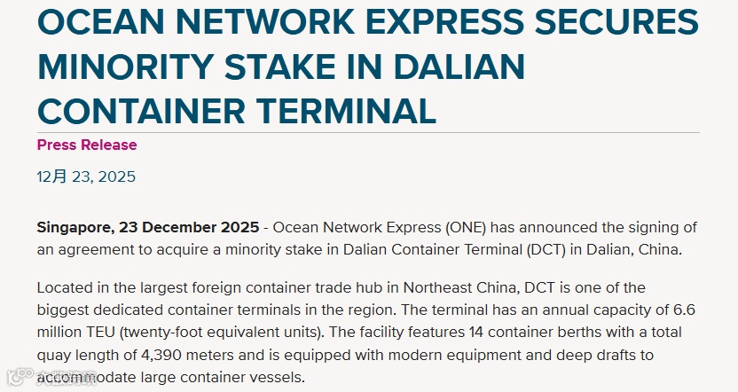 近日,海洋网联船务(ONE)宣布完成对大连集装箱码头(DCT)少数股权的收购。