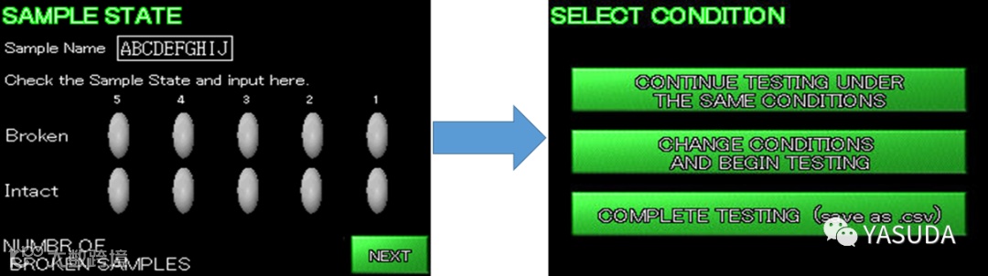 测试完成后,检查样品被锤击的状态并在触摸屏上选择破坏 or 非破坏。
