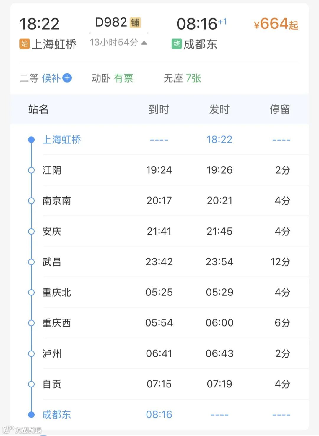 上海虹桥~成都东D982/3/2次:18:22发车,次日8:16抵达,全程13小时54分