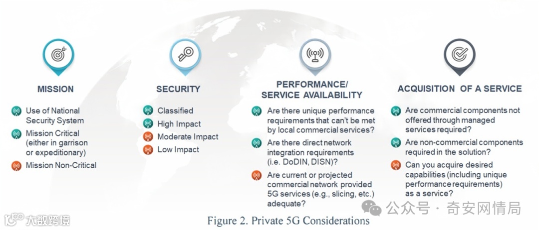 本战略为实施美国防部专用5G网络提供了指导,并介绍了在探索使用专用5G 时需要考虑的事项。如下所述,专用网络需要商业服务不会产生的成本;因此,美国防部必须首先根据运营环境充分评估公共电信网络和托管服务的使用情况,然后再实施专用5G网络。