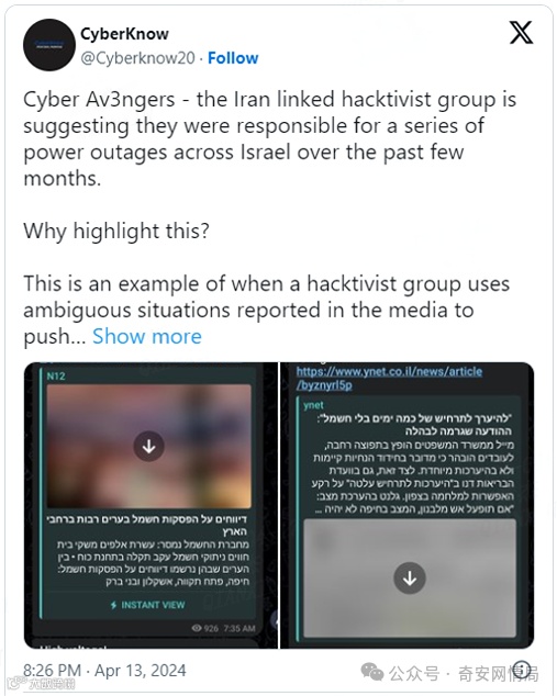 伊朗伊斯兰革命卫队(IRGC)4月13日还声称袭击了以色列网站,敦促居民储存物品并“做好战争准备”。据媒体报道,伊朗支持的团伙“网络复仇者”(CyberAvenger)可能参与了此次袭击,导致多个城市停电。但以色列国家网络局周日表示,“在最近的导弹威胁期间没有检测到异常在线活动,这突显了我们抵御网络威胁的能力。”
