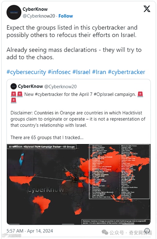 CyberKnow的网络跟踪器显示,2024年4月1日至8日期间,有65个组织参与了针对以色列的活动,实施了DDoS、污损和其他类型的攻击。可能还有其他团体不使用 OpIsrael 标签。CyberKnow 表示,“预计该网络跟踪器中列出的组织以及其他可能的组织将重新将重点放在以色列上。已经看到大量的声明——他们将试图加剧混乱。”