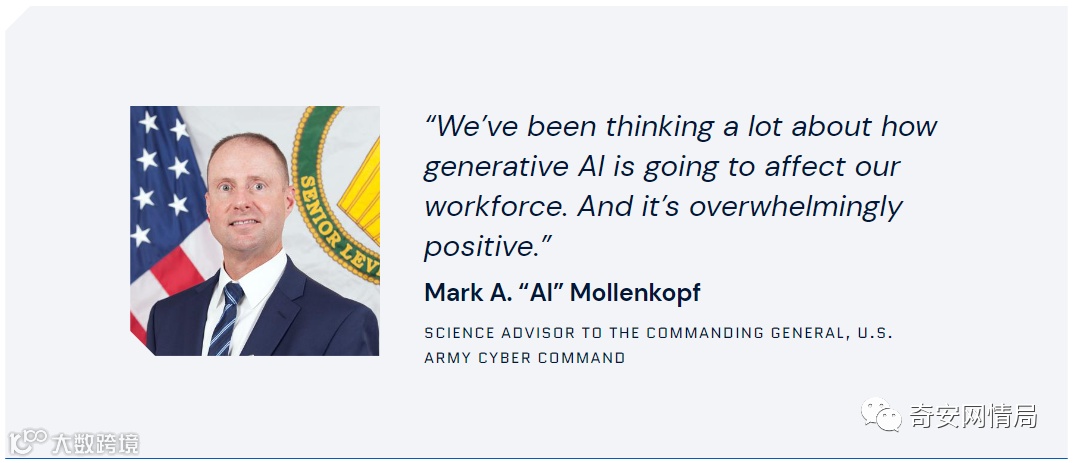 美国陆军网络司令部官员表示,生成式人工智能通过提供文本、图像和音频等内容来响应提示,可能对陆军网络部队特别有用。马克·莫伦科普夫表示,“我认为生成式人工智能将成为一种工具,随着时间的推移,它将真正提高我们一致、集体地完成复杂任务的能力。例如,我们开始在行业中看到,我们可以使用生成式人工智能来生成一些非常复杂的查询,这些查询可以发送到我们的数据平台以总结相关事件或帮助我们从网络安全的角度更好地查看活动。” 莫伦科普夫补充称,这些是近期的能力。
