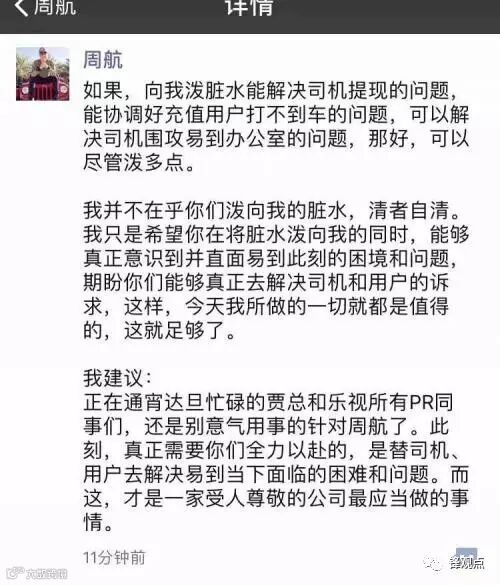 周航在乐视的声明出来后也在朋友圈上回应,表示清者自清,他并不介意乐视的这篇反击,也建议乐视和贾跃亭与其有时间发公关文,不如多用点心去解决现在易到用户和司机所面临的困难。