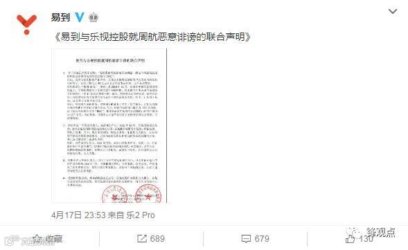 4 月 17 日傍晚,周航对外发表了一份近期易到相关问题的声明。在这份声明当中,周航非常明确地正面指出:易到当前确实存在着资金问题,而这个问题最直接的原因就是乐视挪用了易到的 13 亿资金,才导致后来易到资金链断裂,无法给用户和司机提现。并称易到这事并非简单的债务纠纷,有可能会引发影响社会稳定的群体性事件。希望乐视和贾跃亭能够站在社会责任的角度,妥善处理好易到的问题。