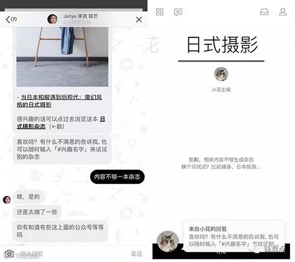 理论上你可能根据自己的兴趣,定制任何内容的杂志。但如果你定制的兴趣过于小众,则可能会因为内容太少无法创建杂志。比如锋观点发送了“#日式摄影”关键字,编辑只推送了几篇文章,而且因为内容太少也不够生成杂志。不过,轻芒团队会主动向你询问相关内容的公众号。