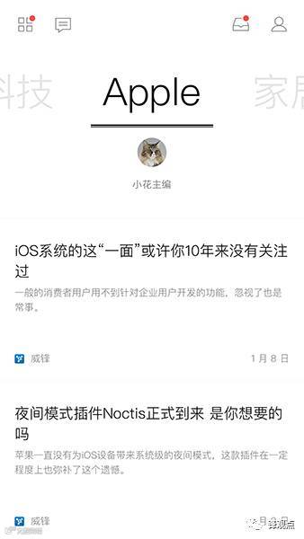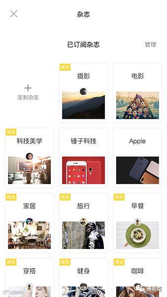 而杂志的内容是由主编筛选整合多个来源的高质量内容,比如“Apple杂志”下的内容来源主要来自威锋网。杂志分类主要以兴趣作为依据,包括科技、摄影、家居、美食、旅行等多种主题的精美数字杂志。