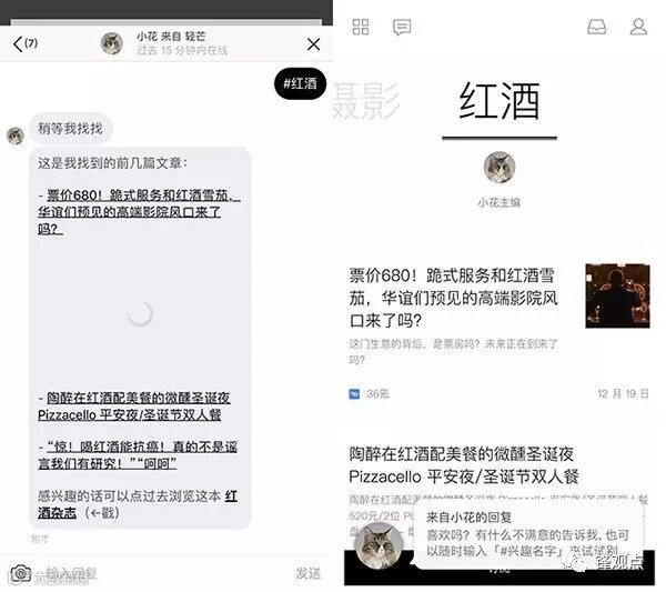 除此之外,你还可以自己定制杂志,在与编辑的聊天界面发送“#兴趣名字”,编辑便会为你推荐该兴趣下的杂志内容。比如说如果你想订阅一本关于“红酒”的杂志,便可发送“#红酒”关键字,然后编辑便会自动推送关于红酒的杂志。