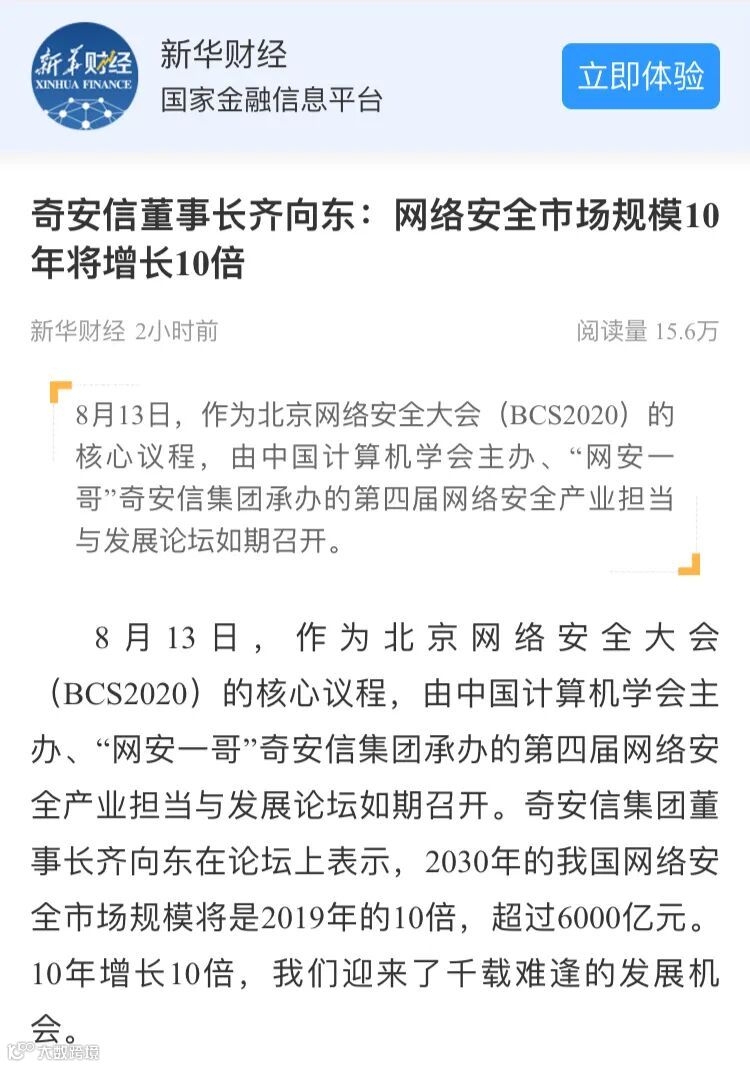 奇安信集团董事长齐向东在论坛上表示,2030年的我国网络安全市场规模将是2019年的10倍,超过6000亿元。10年增长10倍,我们迎来了千载难逢的发展机会。
