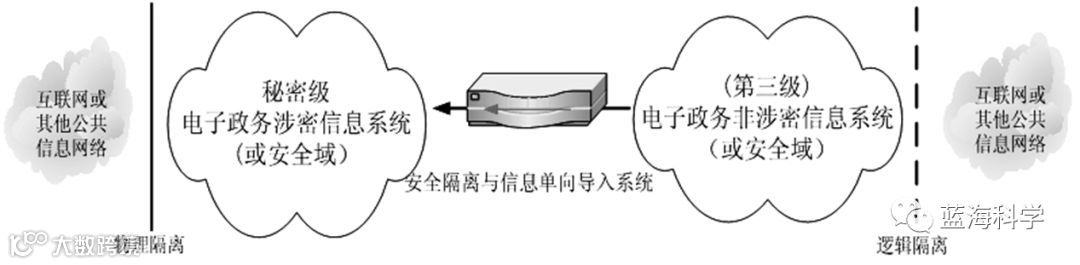 但国内方面,一直是要求物理隔离,不存在信息交换。直到后来,电子政务的蓬勃发展,终于从铁板中撬开一条缝隙,允许“电子政务涉密信息系统和与互联网逻辑隔离的电子政务非涉密信息系统的单向导入”。如果觉得这句话理解起来费劲的话,看下图即可:
