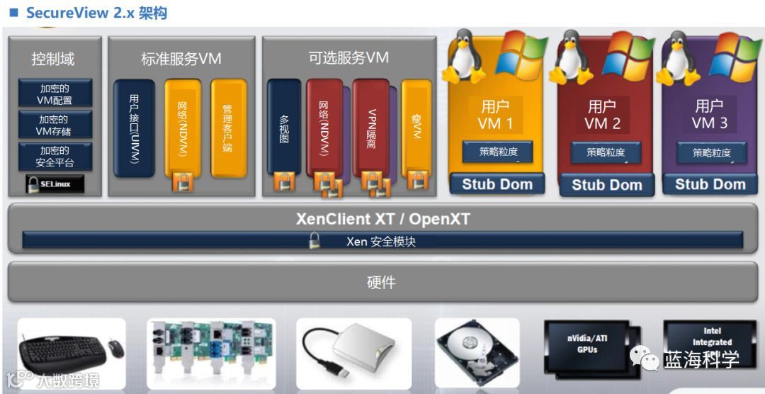 SecureView是空军开发的访问型CDS产品,使用单台计算机承载在不同分类级别上运行的多个来宾虚拟机(VM)。其架构如图所示: