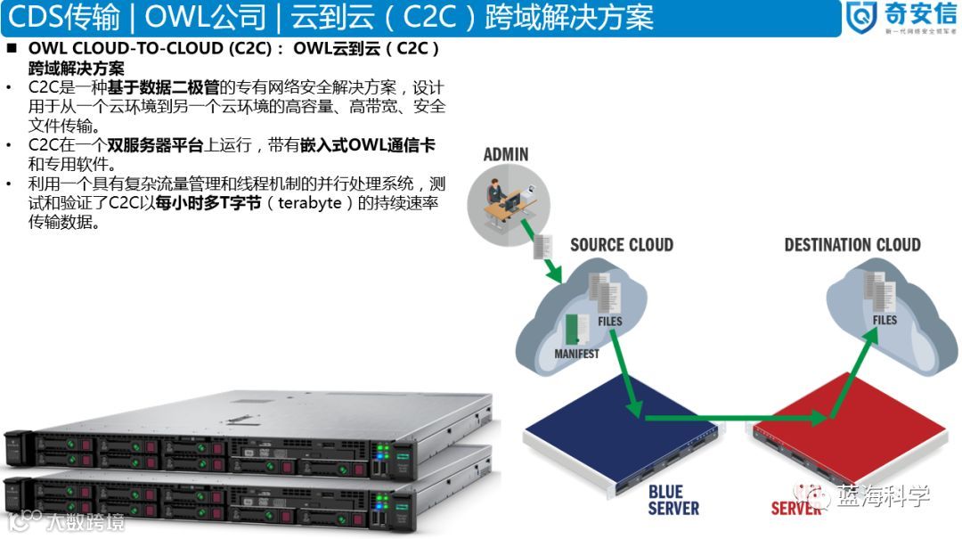 2018年,OWL还推出了基于云的“云到云”高速跨域解决方案。可以将大量数据从一个云快速移动到另一个具有不同安全等级的云,最大能满足25 Gbps的吞吐率。