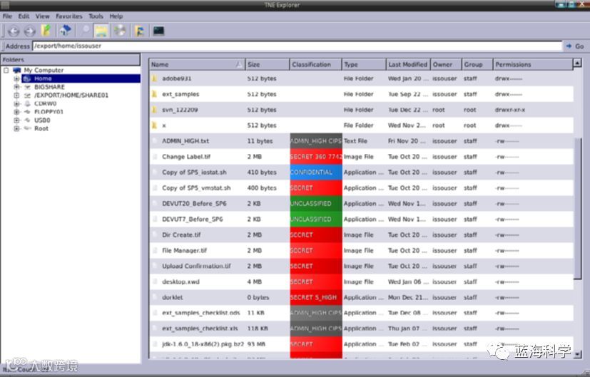从TNE资源管理器的截图界面中,可以看出,资源管理器已经内置了密级标识,并且用各种颜色标识。很明显,红色都是高密级的对象。