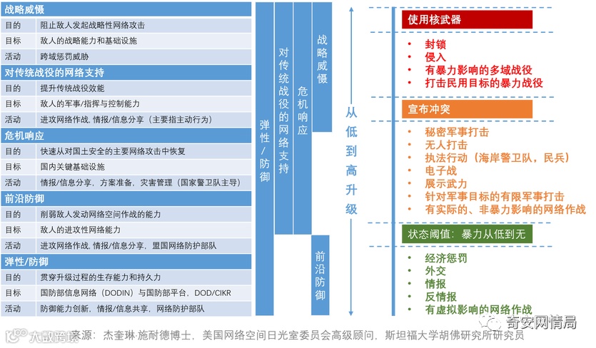 解决这些逻辑问题需要从竞争模式转向互补模式。下图展示了美国网络战略中的主要工作重点,重点是国防部,因为大多数对战略指南的重大修改都是针对五角大楼。该图表显示了每项努力的目的、活动的目标和类型。最后,在所谓的升级阶梯上描绘了这些努力路线,这有助于定义每条努力路线的开始时间和概念上的结束时间。此外,该图将这些活动与其他使用武力或外交政策手段进行了比较,以说明该战略如何与跨域升级频谱努力路线保持一致。
