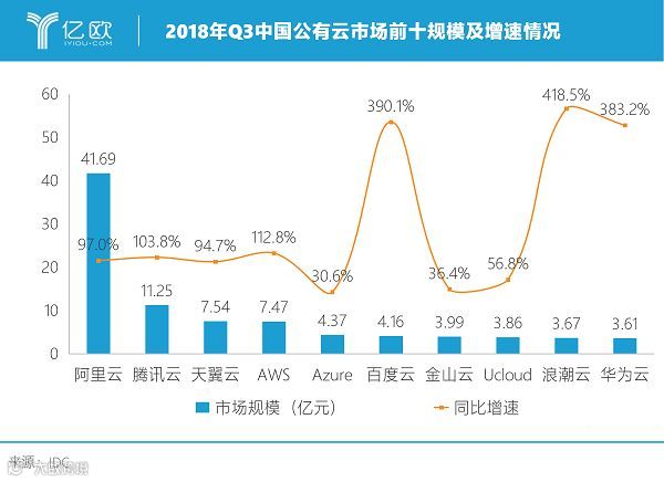 与微软同样拥有企业服务经验的浪潮云,在国内市场也保持了高速增长。根据IDC发布的《2018年第三季度中国公有云服务市场季度跟踪报告》显示,浪潮云首次跻身2018年第三季度中国公有云整体市场份额前十,市场增速居于第一。浪潮云相比其他进入大型厂商队列的云计算厂商来说,虽然进军公有云时间较短,但增速显著,这似乎与其33年来在传统企业(如教育、金融、交通等)摸爬滚打所积累的企业落地经验相关,也可能与浪潮云把政府领域积累的安全和服务能力应用到企业级市场密不可分。