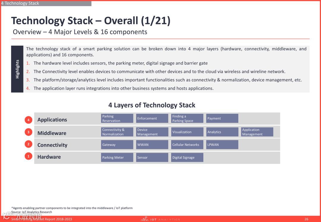 该报告对智慧停车解决方案的技术堆栈进行分解,主要分成了4个主要的层级(硬件、连通性、中间件和应用程序)和16个组件。