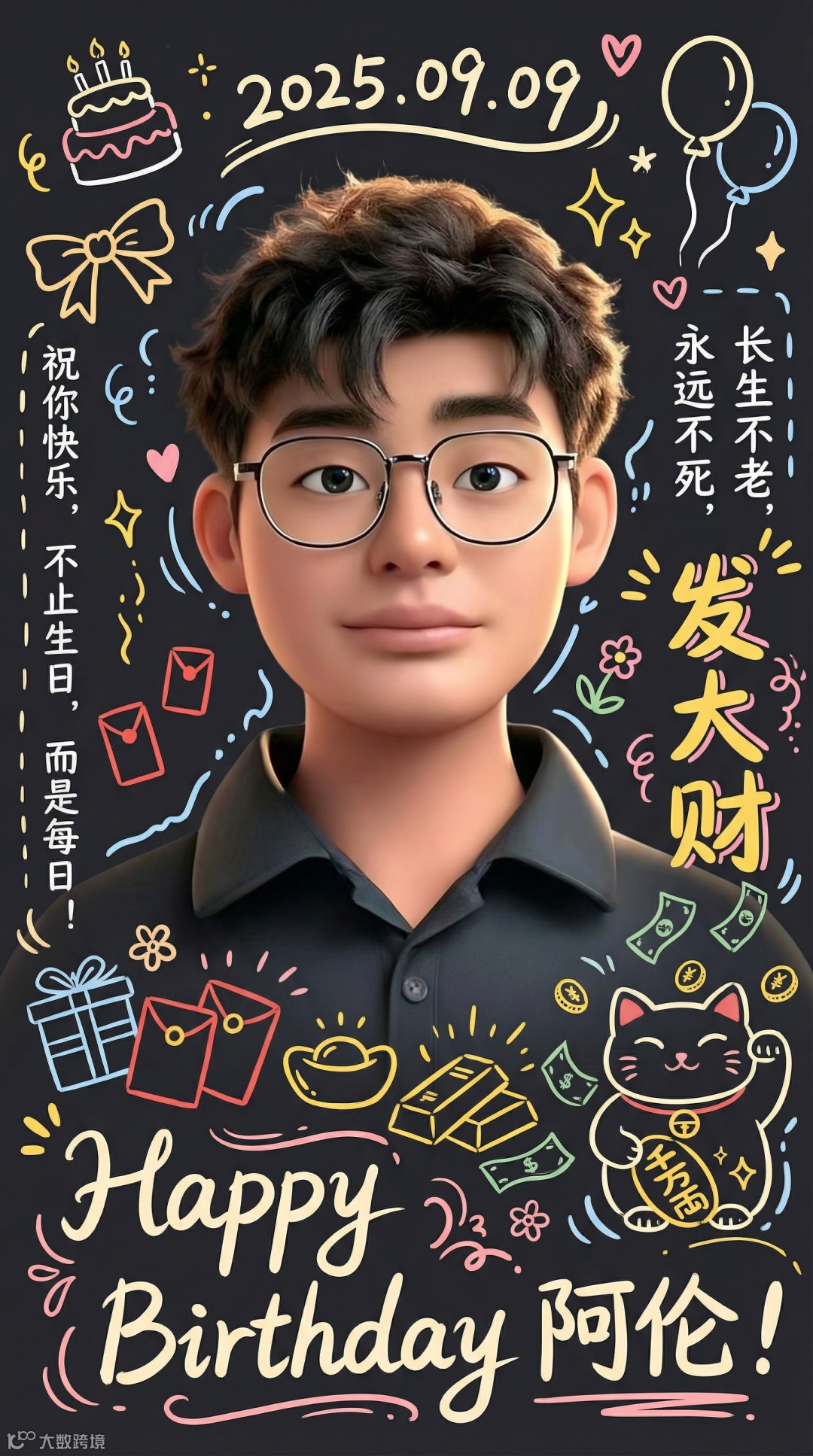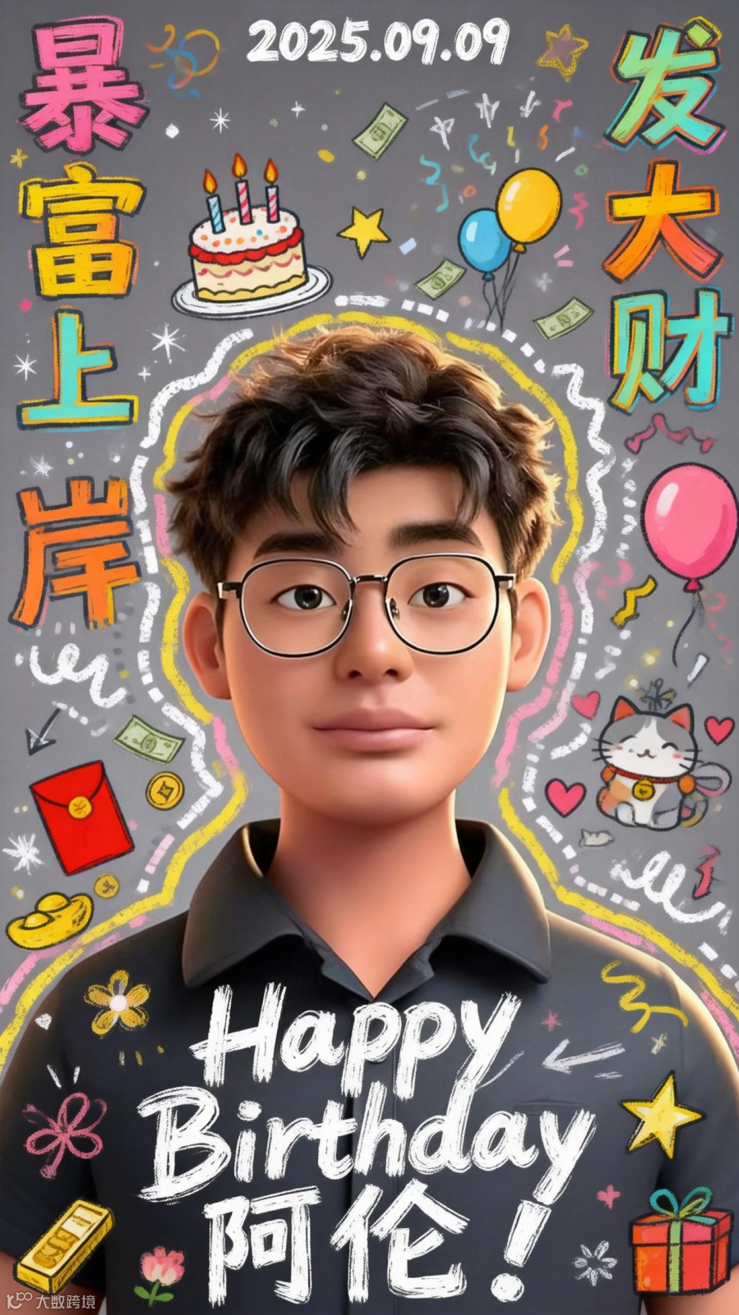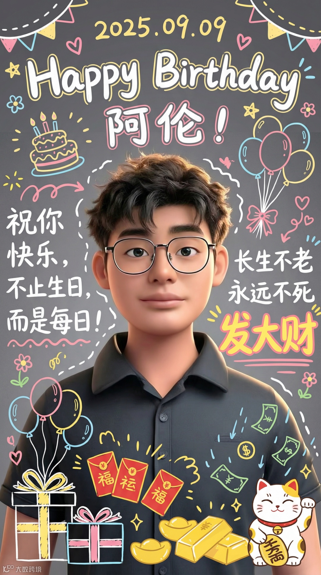 生成一张手机竖屏 9:16 生日涂鸦照片: