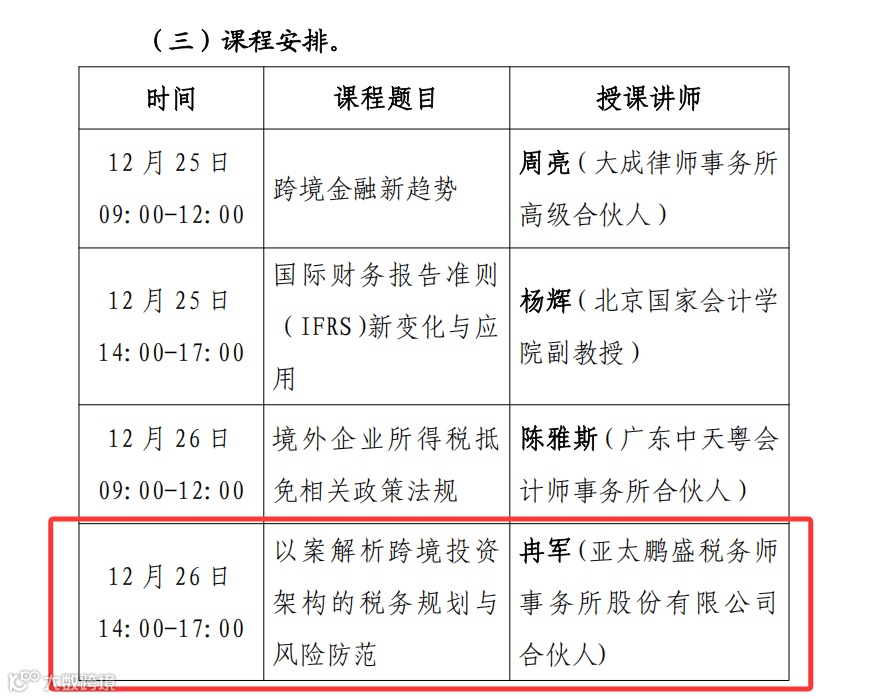 本次是冉军老师12月第二次为注册会计师、注册税务师群体开展跨境涉税专题培训。首次培训于12月5日由深圳市注册税务师协会主办,面向深圳税协执业个人会员,主题同为跨境投资架构的税务建议与风险防范,获同行高度评价。