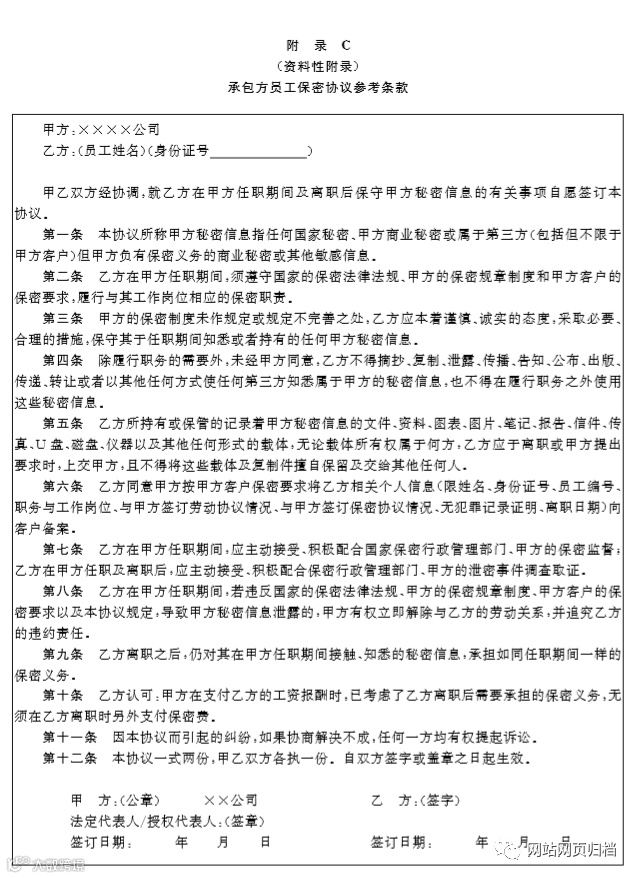 7.5.2.5 承包方应与员工签订书面的保密协议(或保密承诺书),要求员工承诺在工作过程中不摘抄、删改、复制、泄露发包方的档案和其他信息。保密协议的条款可参见附录C。